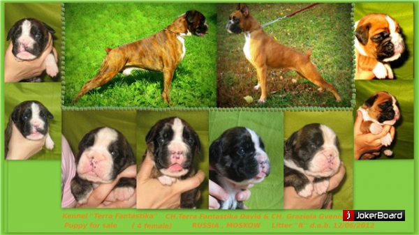 Питомник РКФ предлагает щенков боксера. Рождение 12. 06. 2012. Четыре девочки. 3 тигровые расписные и 1 рыжая расписная. Родители титулованные. Помогаем с кормами, ветобслуживанием, выставками и дрессировкой.
