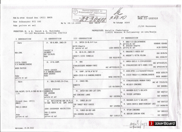 Отец: Гранд Сен Эмир (Экспорт Польша) 1 год 9 месяцев. Юный Вице-Чемпион Европы 2011 (Нидерланды) Юный Чемпион Клуба, Юный Чемпион России, 2*Юный Чемпион Украины, Чемпион Клуба, Чемпион России, Чемпион Украины CACIB, Гранд Чемпион Украины, Чемпион Беларуси, 4*CACIB, Чемпион РКФ, HD-AA, T-1
